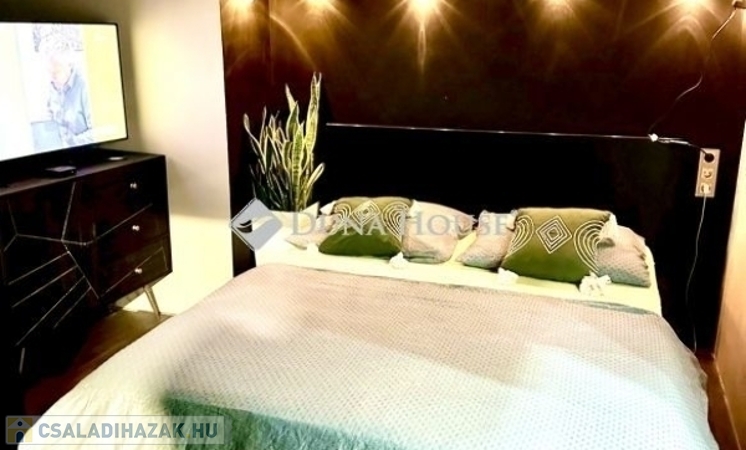A ház mellett került megépítésre egy külső lépcső, mely felvezet minket az emeletre. Itt is található egy az udvarra néző 20nm tetőtéri terasz. A bejárati ajtaja és ablakai az emeleti lakásnak szintén műanyagok már. Belépve az ajtón egy tágas, napfényes amerikai konyhás nappalis kialakítás kapott arcot 2024-ben. A nappaliból nyílik egy hálószoba és egy zuhanyzós fürdőszoba. A nappali nagyságából adódóan szükség szerint még egy kis szoba kialakítható akár. Emeleti belmagasság 2,36m.