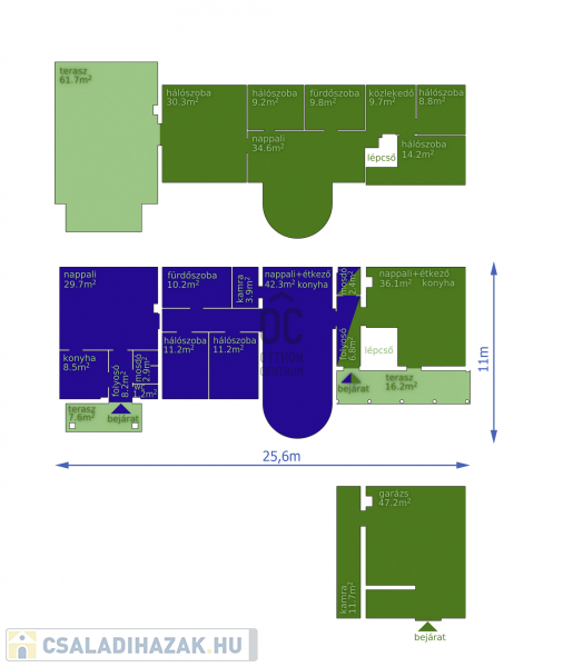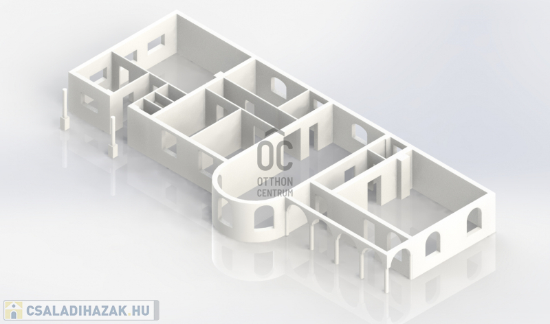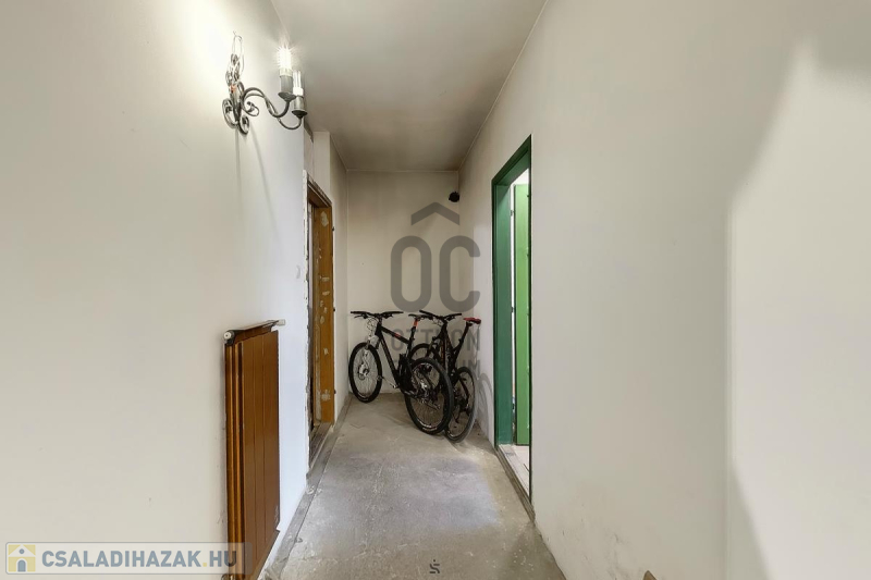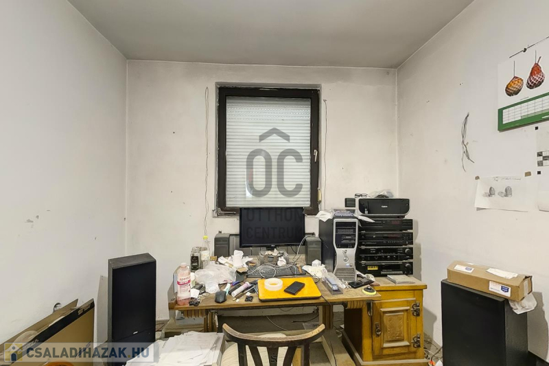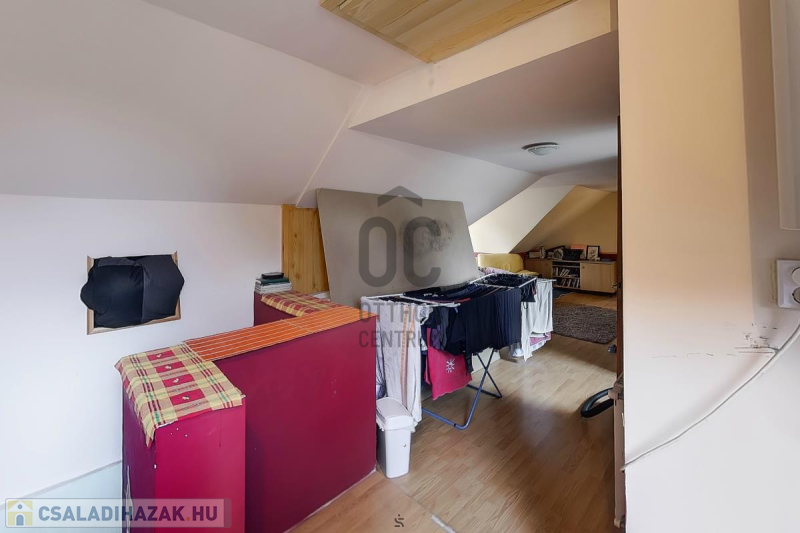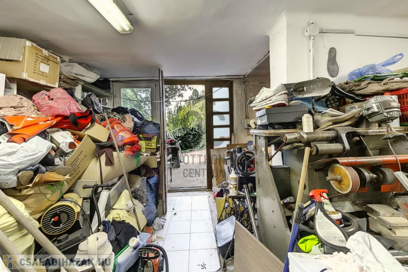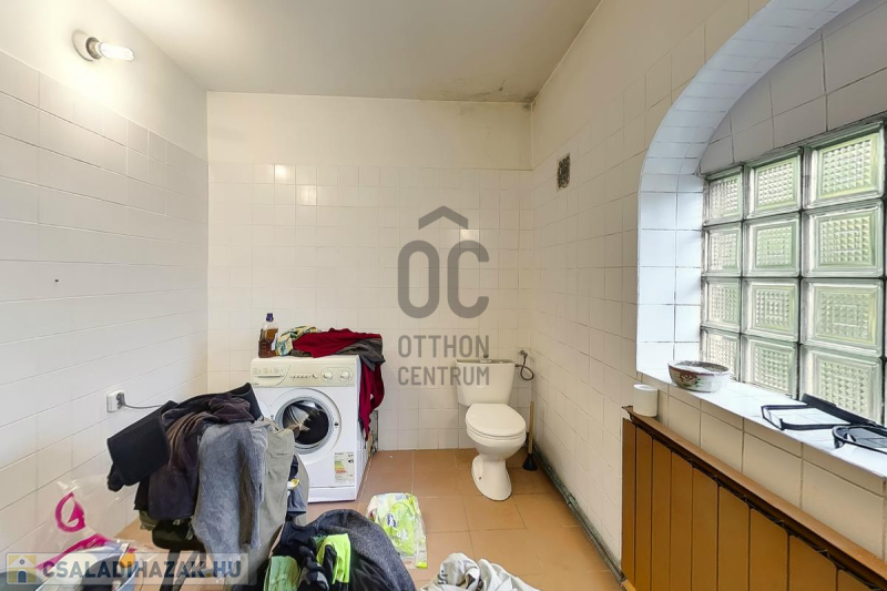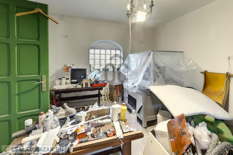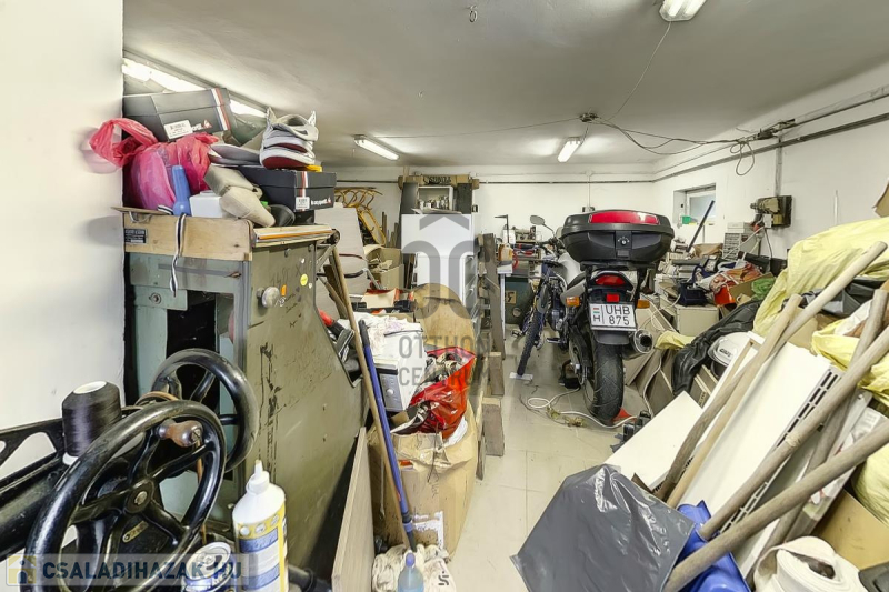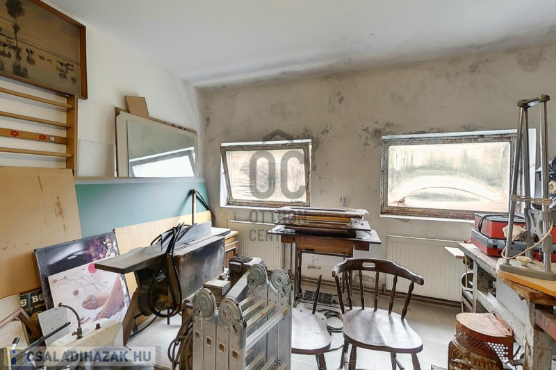 Ház: 2 bejárat így külön is válaszhatóan , 2 szintes , tégla , klasszikus 2 generációs ház , 3 nappalival + 5 hálószobával , 2 fürdővel , nagy műhellyel és garázzsal , tetőterasszal befejezésre váróan .