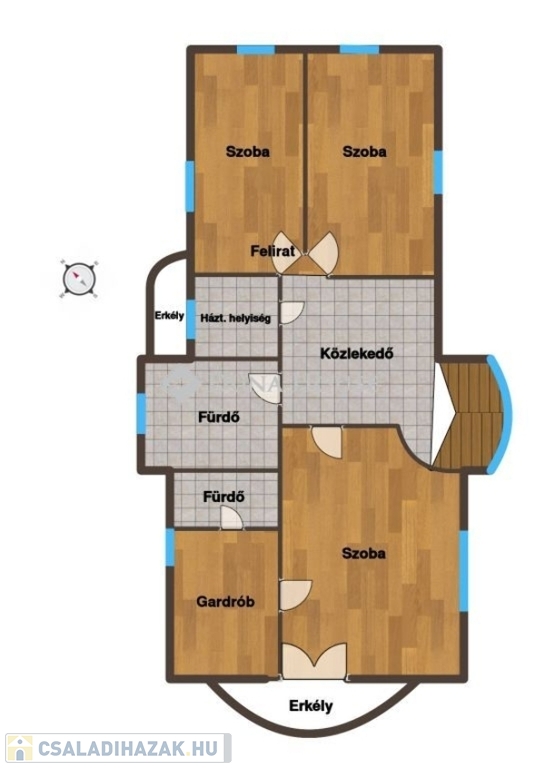 A felső szinten egy fenti nappaliként szolgáló tágas közlekedő, egy nagyméretű, saját gardróbbal és fürdőszobával rendelkező szülői hálószoba valamint további két hálószoba kapott helyet.