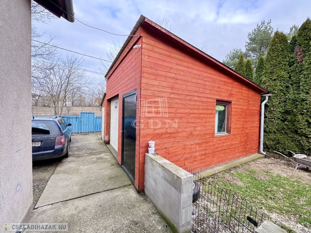 Elöl az udvarban garázs (műhelynek is alkalmas), és tároló is található.