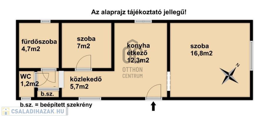 - A 48m2-es lakóterű ház helyiségei: 2 szoba, közlekedő, fürdőszoba, külön WC, konyha-étkező.