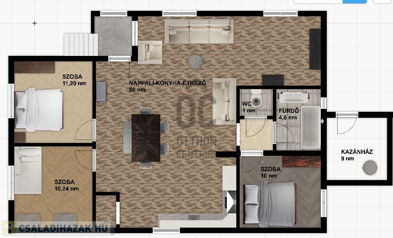 Az 50 nm-es nappali/konyha/étkező részből igény és szükség szerint leválasztható még egy 9 nm-es szoba (eredetileg is le volt választva).