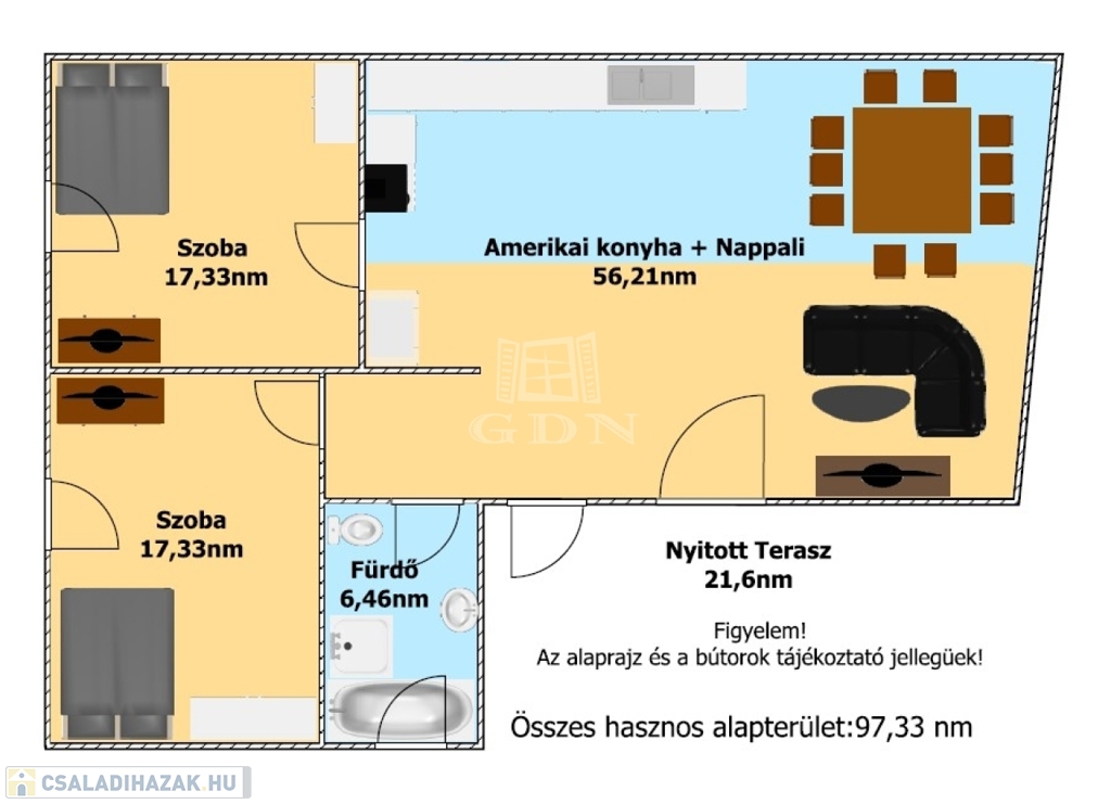 - amerikai stílusú konyha + nappali,
