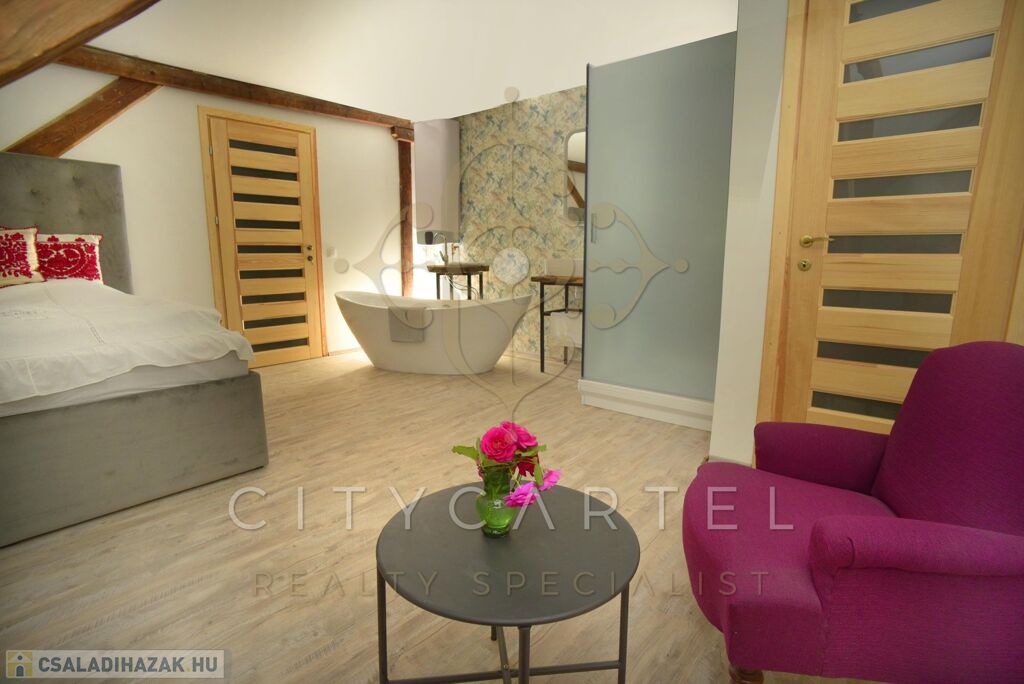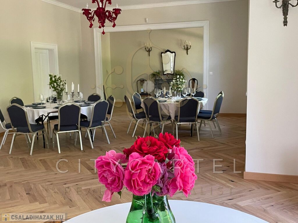 - Földszint: elegáns előtér és hall, 120 nm-es bálterem (amely alkalmas céges rendezvények, kisebb konferenciák, családi események és esküvői vacsorák megtartására 40-50 főig), egy hálószoba káddal, két fürdőszoba, konyha, kiszolgáló területek