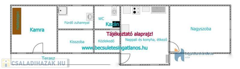 – Belmagasság, elrendezés: konyha-étkező, egy nagyszoba, egy hálószoba, fürdőszoba (tusolóval), külön WC-helyiség.
