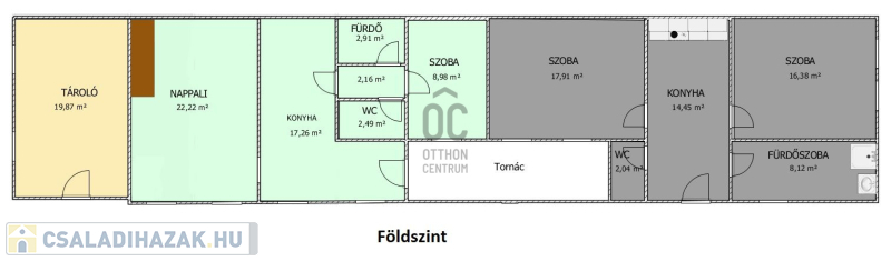 A ház 410nm-es 3 gépkocsi parkolóhellyel ellátott telken helyezik el. A két lakrész teljesen elkülönül egymástól, a kisebb házrészben (mely közelebb helyezkedik el az utca fronthoz) nappali, hálószoba, konyha, fürdőszoba, külön toalett került kialakításra. A nagyobb házban a földszinten, konyha, nappali, fürdőszoba, toalett, 1 hálószoba, az emeleti szinten 3 hálószoba, fürdőszoba került kialakításra.