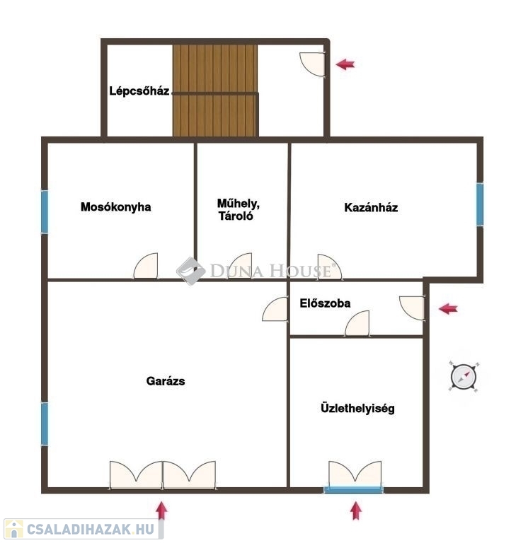 Az ingatlan 4 hasznos szinttel rendelkezik. Földszintjén kiszolgálóhelyiségek találhatóak, egy 2 állásos garázs, egy mosókonyha, egy kazánház, és egy korábban üzlethelyiségként hasznosított helyiség kaptak itt helyet. A szint könnyen lakótérré is alakítható, az ehhez szükséges összes adottsággal rendelkezik.