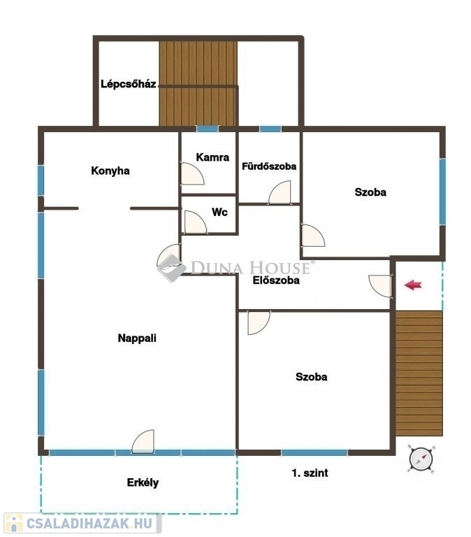 Első lakószintjén egy nappali + 2 hálószobás lakás található, melynek szobaszáma könnyedén növelhető. Nappaliszobájából tágas erkély is nyílik.
