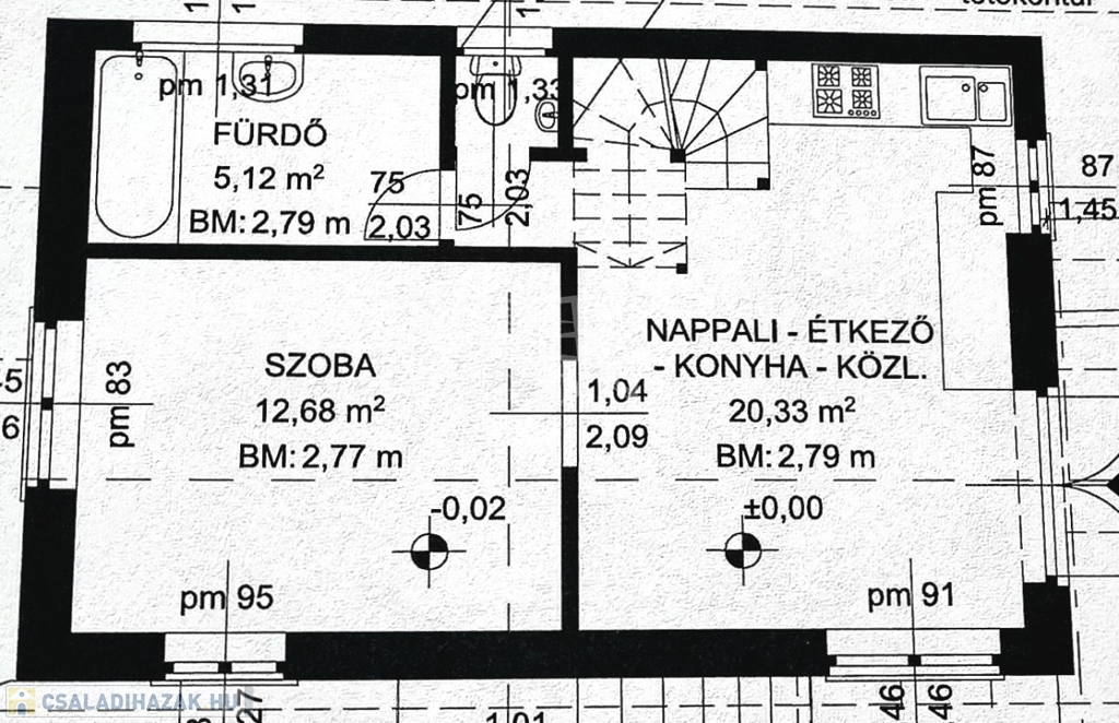 Az alsó szinten 1 szoba, tároló, a földszinten amerikai konyhás nappali, háló, fürdő, wc lett kialakítva.