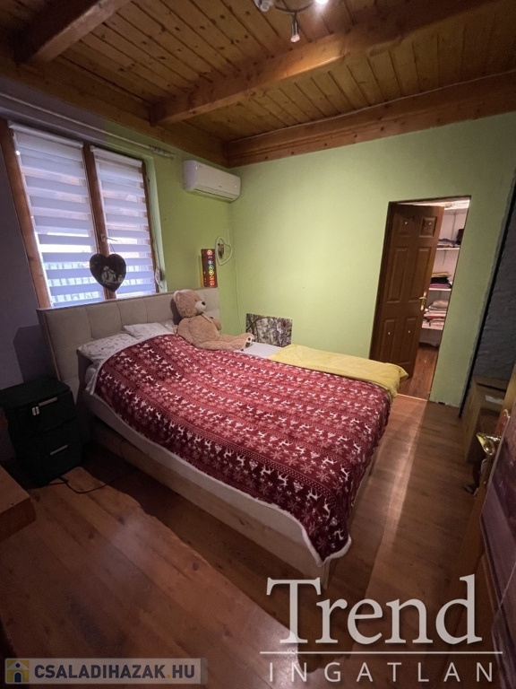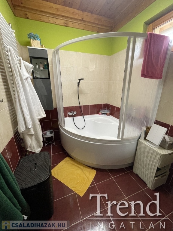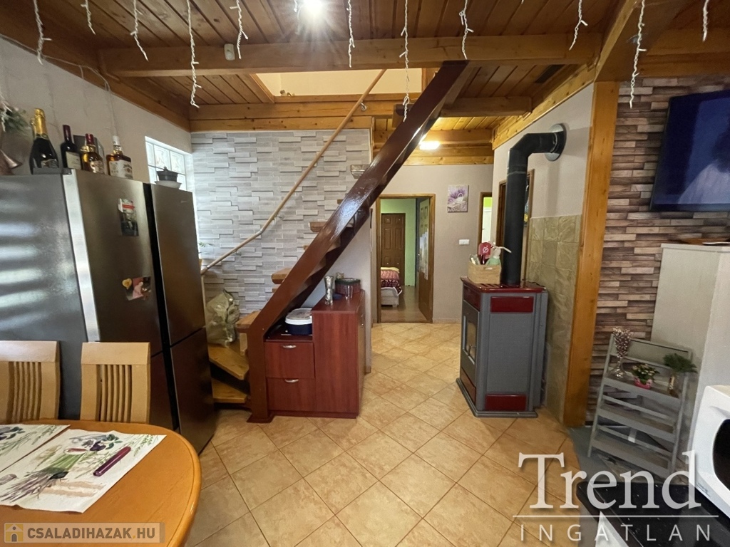 A tetőtérbe fából készült lépcső feljáró vezet, ahol két hálószoba került kialakításra. A konyha elektromos sütővel, főzőlappal, szag elszívóval lett felszerelve, a nappaliban kapott helyet egy vízteres kandalló, mellyel kiválóan befűthető az egész ház, ezen kívűl kombi gázkazán is beépítésre került. A földszinten egy, a tetőtérben mind két szobában találhatón hűtő-fűtő klíma berendezés. Az összes nyílászáró fából készült, melyek redőnnyel és szúnyoghálóval vannak szerelve. Az ingatlant 4 kamera és riasztó rendszer biztosítja, a nagy kapu és a garázs kapu elektromos, távirányítóval működtethető. A garázs 16 m2, mely járólapozva van és fűthető.