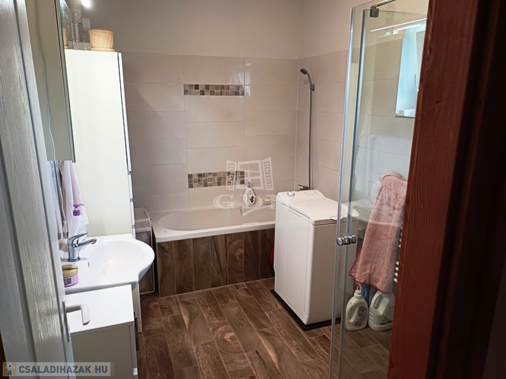 Burkolatai a vizes helyiségekben kerámia lap, a nappaliban és a szobákban laminált parketta.