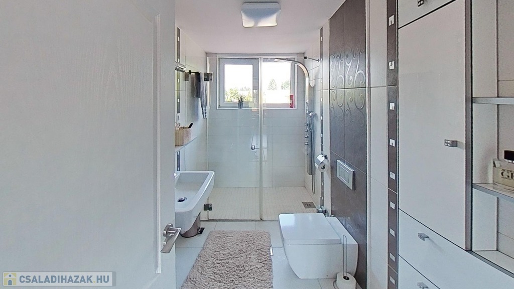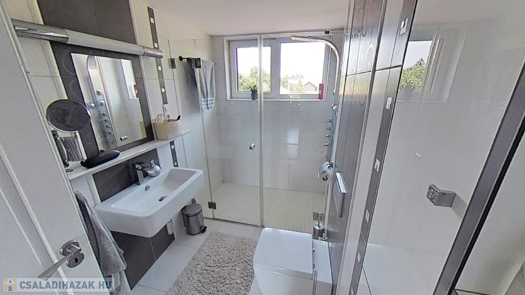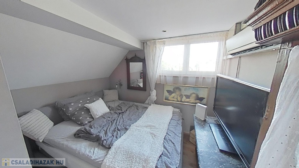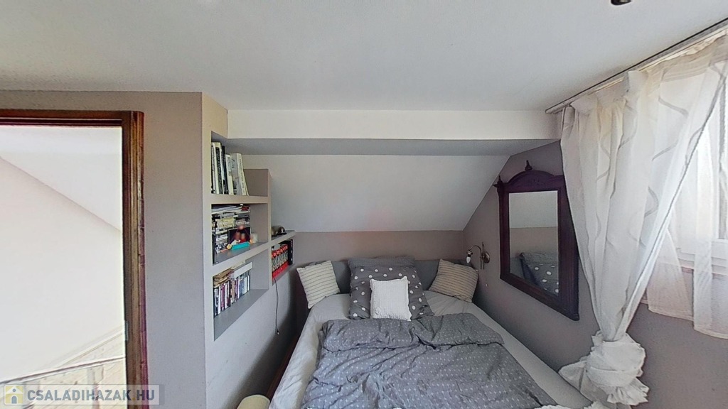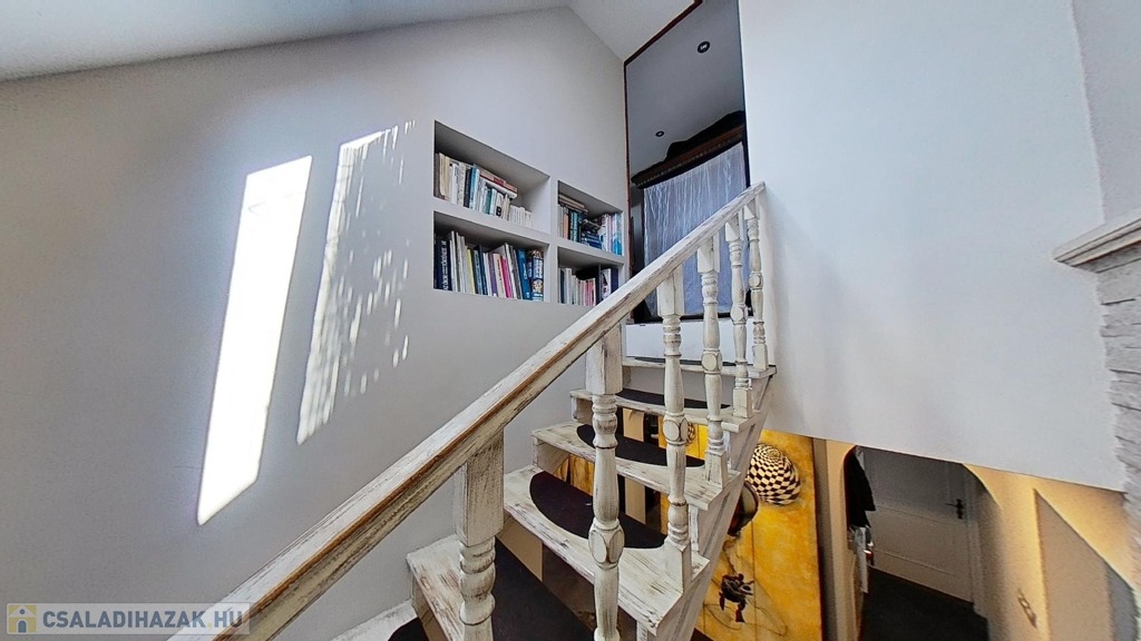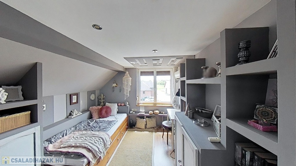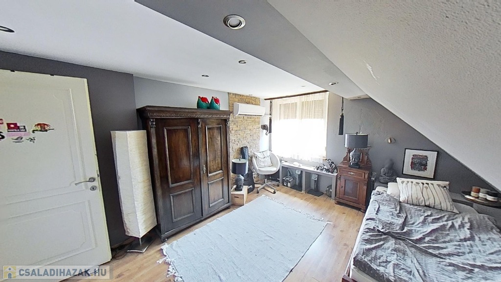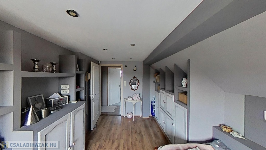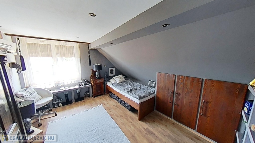 Az emeleten további 2 teljes értékű és egy fél hálószoba, fürdőszoba/wc, valamint egy gardrób szoba került kialakításra, picit több, mint 40 hasznos négyzetméteren.