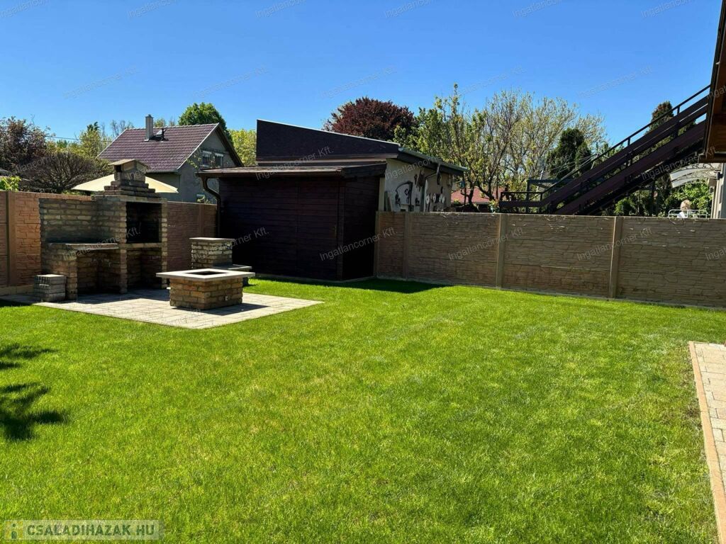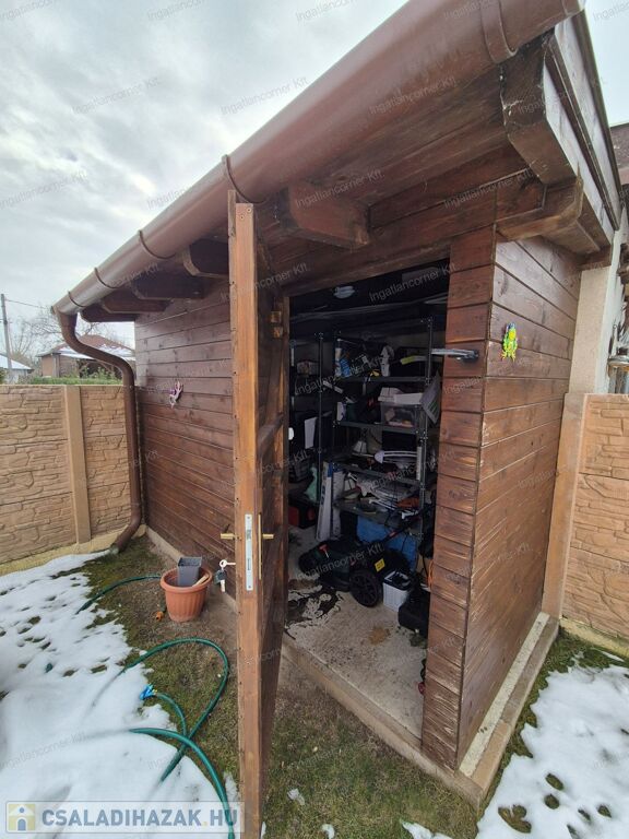 -KERTI SZERSZÁMOS: a telek jobb sarkában egy beton alapra épített ZÁRT kerti szerszámos is elérhető, ami számtalan dolog tárolására alkalmas: sz:1,5m x h: 3,4m-es.