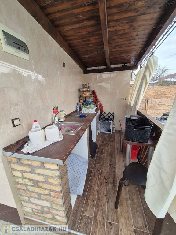 Elosztás: Egy 10m2-es szobából és egy ablakkal rendelkező külön mellékhelyiségből áll, ami 1,62m2-es és egy 4,29m2-es nyári konyhából, ahol pultba épített mosogató, 2 állásos elektromos főzőlappal felszerelt.