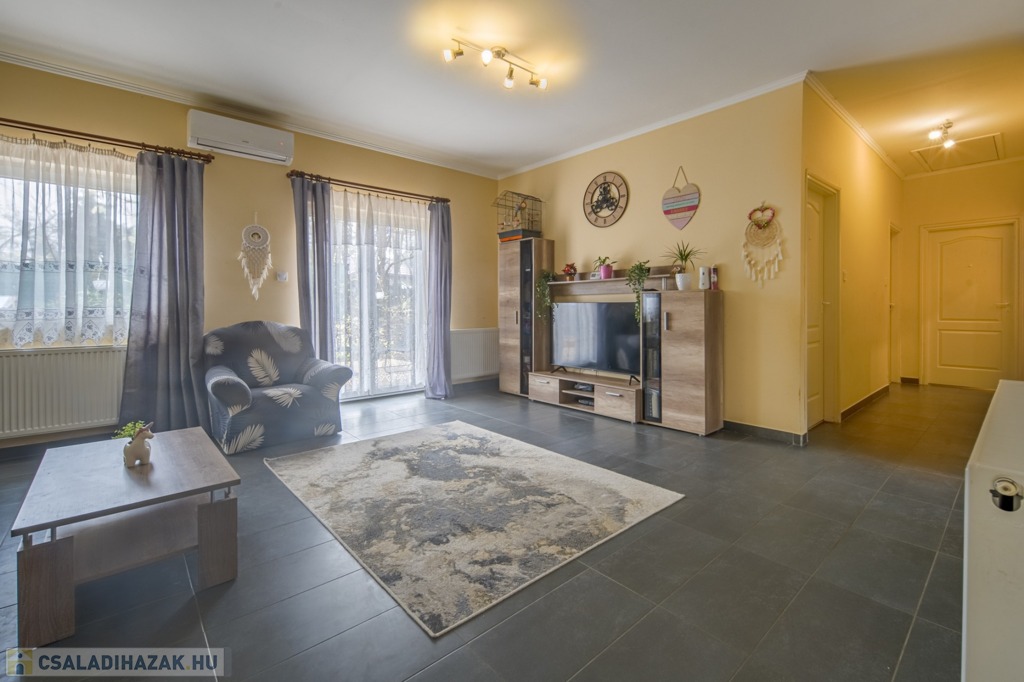 A 736 m²-es telken elhelyezkedő ingatlanban 3 hálószoba, amerikai konyhás nappali, fürdőszoba, vendégmosdó és egy spejz kapott helyet.