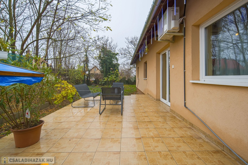 Az ingatlan a 22 m²-es garázson keresztül kapcsolódik a szomszédos épülethez. A nagyméretű teraszra a nappaliból lehet kilépni, és a telek elrendezésének köszönhetően az ingatlan szinte teljesen körbejárható.