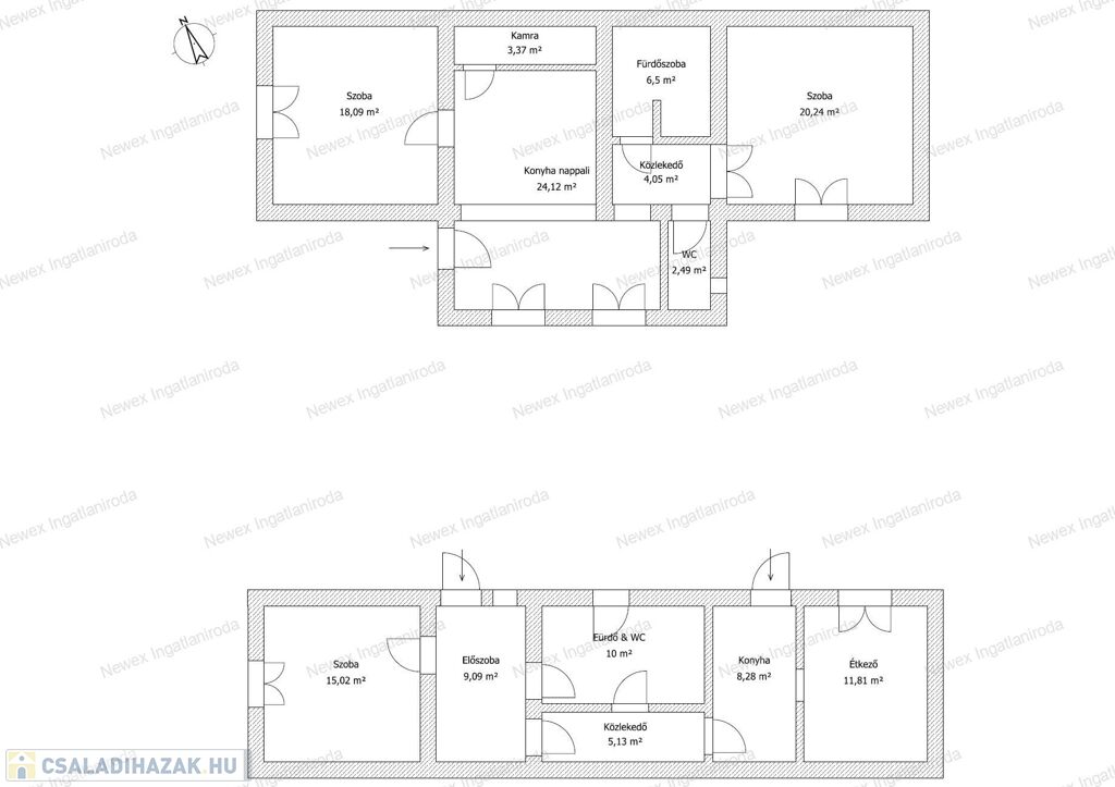 A telken található épületek 79 m² és 60 m² alapterületűek, az udvar két oldalán, egymással szemben helyezkednek el, így mindkét ház külön életteret biztosít.