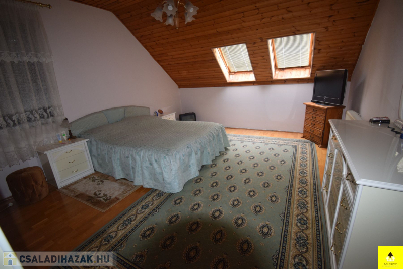 A felső szinten 3 nagy méretű hálószoba, egy tágas közlekedő és egy fürdőszoba kapott helyet.