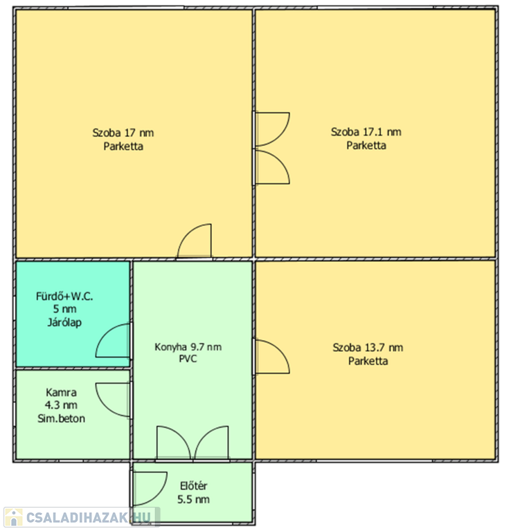 Helyiségei: 3 szoba, előtér, fürdőszoba, konyha, kamra/padlásfeljáró.