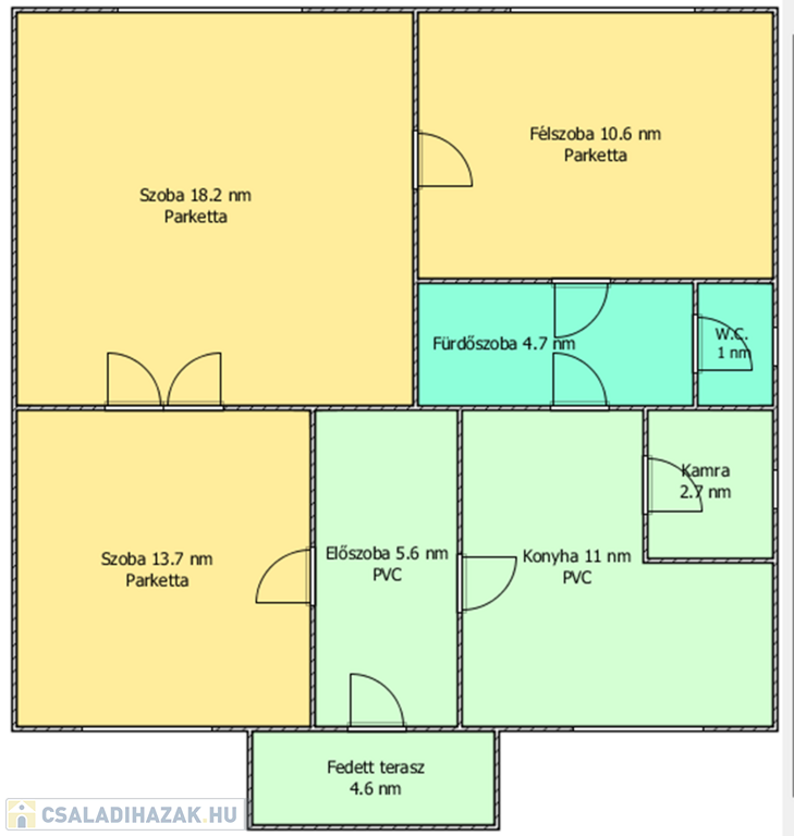 Helyiségei: 2 szoba, 1 félszoba, előszoba, fürdőszoba, külön nyíló W.C., konyha, kamra, fedett terasz.