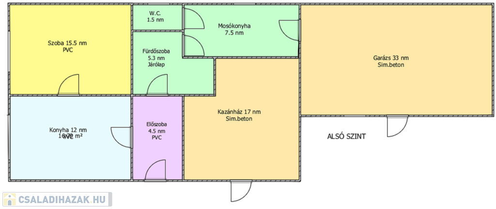 Az alsó szint helyiségei: 1 szoba, konyha, fürdőszoba, külön nyíló W.C., mosókonyha, előszoba, kazánház, dupla garázs.