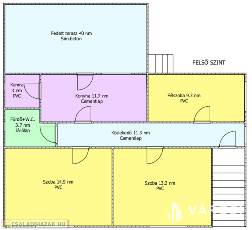 A felső szint helyiségei: 2 szoba, 1 félszoba, előszoba, fürdőszoba, konyha, kamra, fedett terasz.