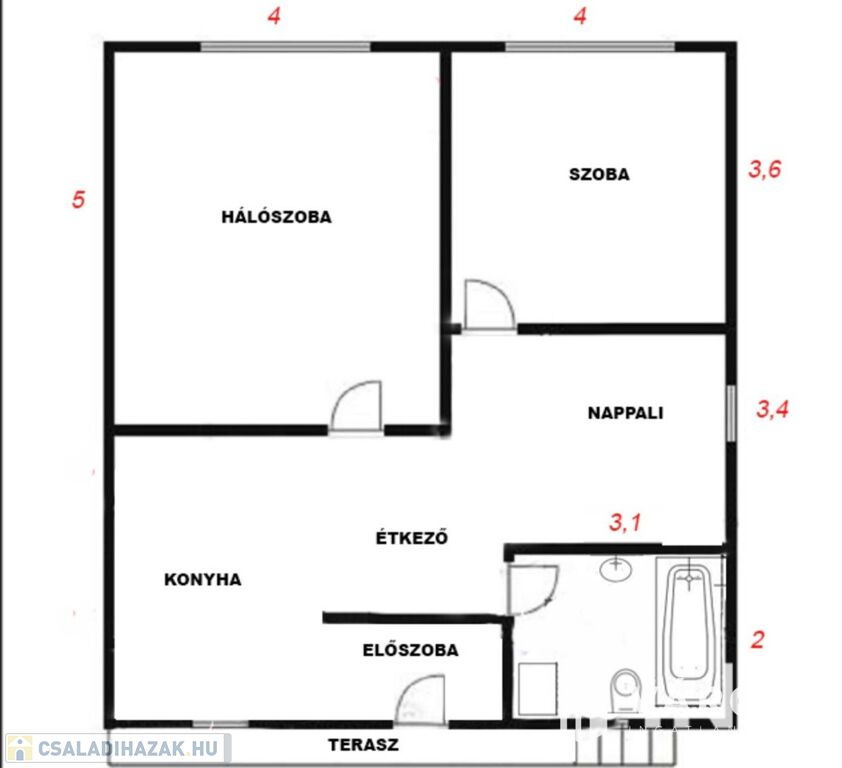 Helyiségei: Előszoba, konyha, étkező, nappali, fürdőszoba, 2 külön nyíló szoba.