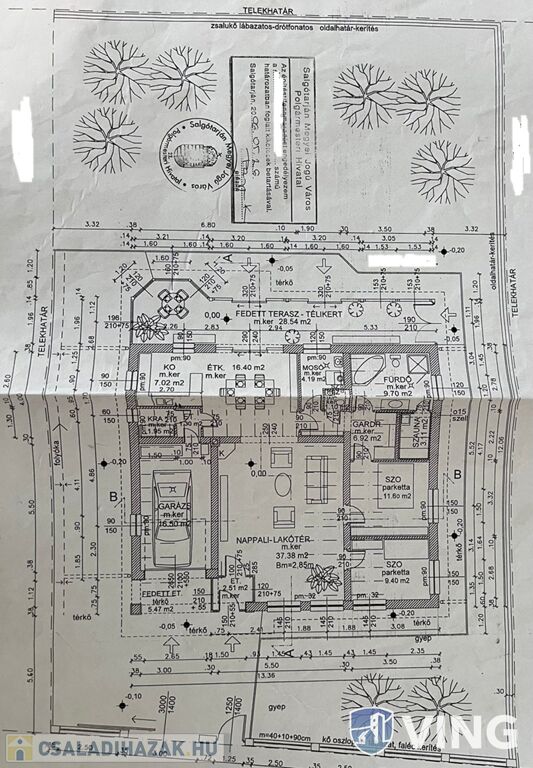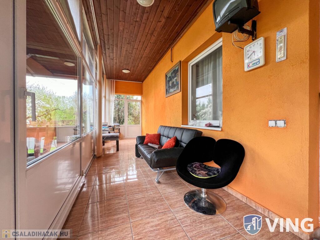 Helyiségei: 2 hálószoba, nappali, konyha+étkező, kamra, közlekedő, gardrób, mosóhelyiség, fürdőszoba, szauna, külön nyíló W.C., szélfogó, garázs, beépített terasz, nyitott terasz.