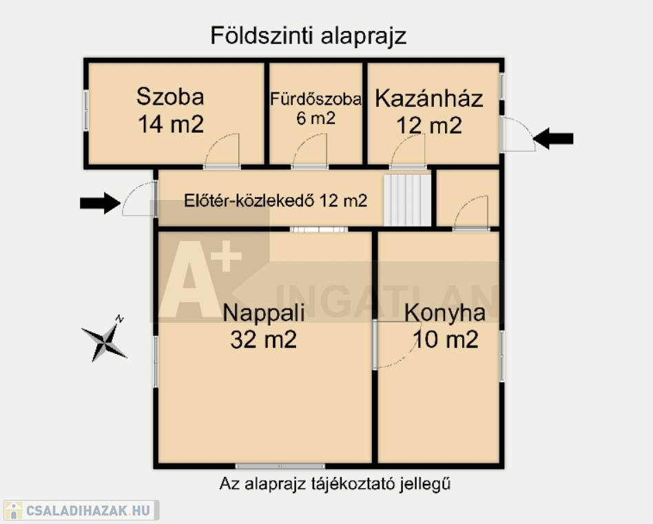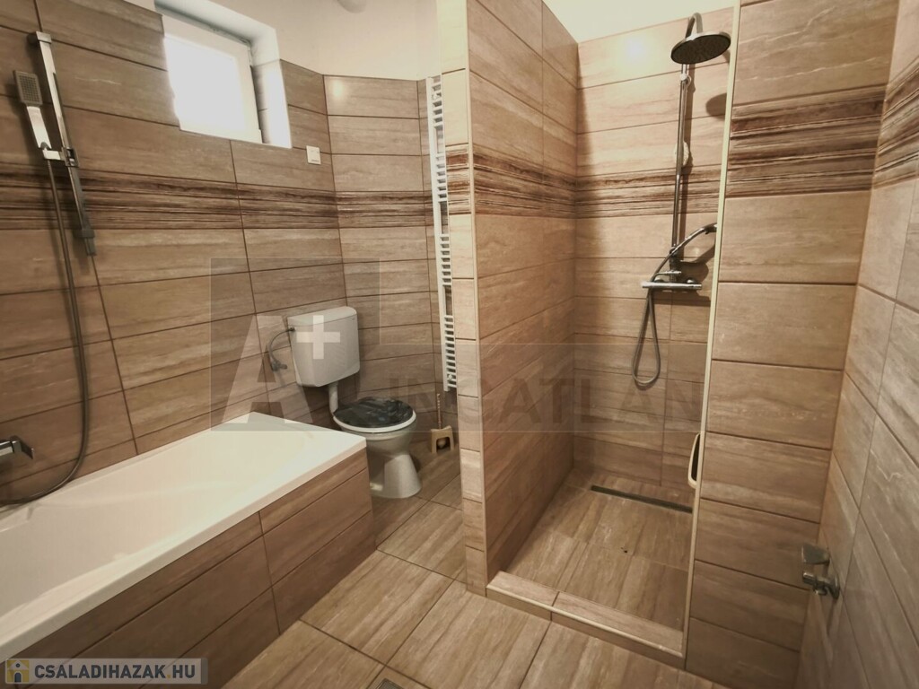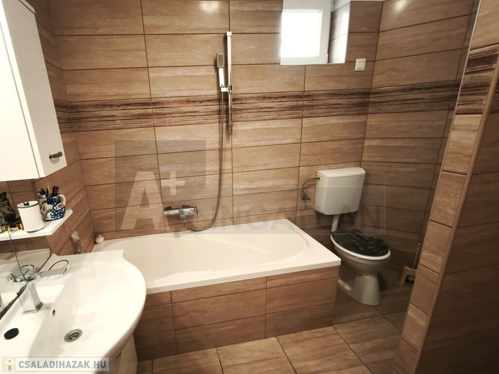 Földszint: konyha, nappali + 1 szoba, kádas fürdőszoba wc-vel, kazánház