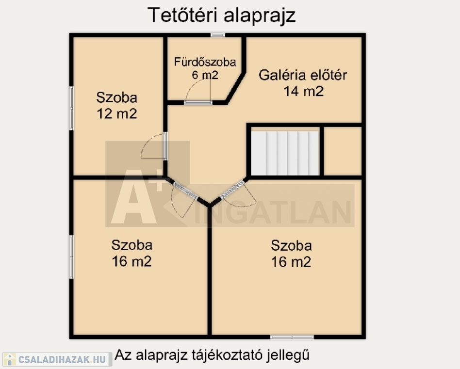 Tetőtér: 3 szoba, fürdőszoba tuskabinnal és wc-vel, galéria