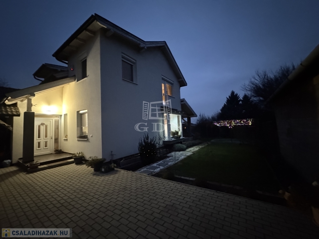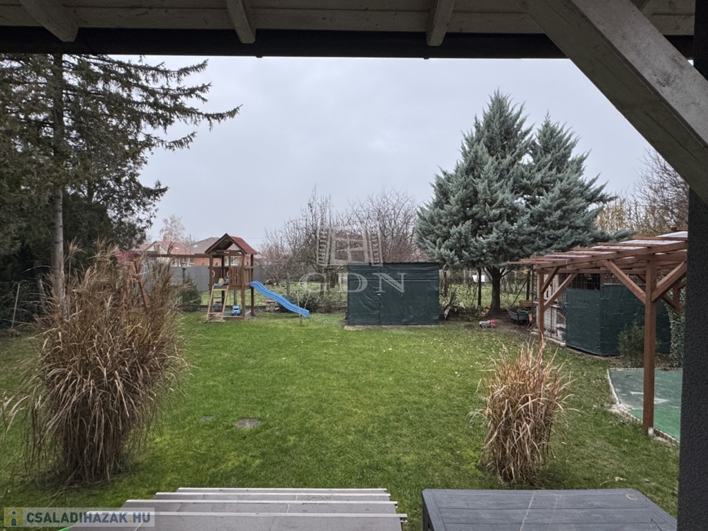 A telek 584m2, egy része térkövezett, hátsó része füvesített. A házhoz kapcsolódik egy fedett beálló és egy garázs is.
