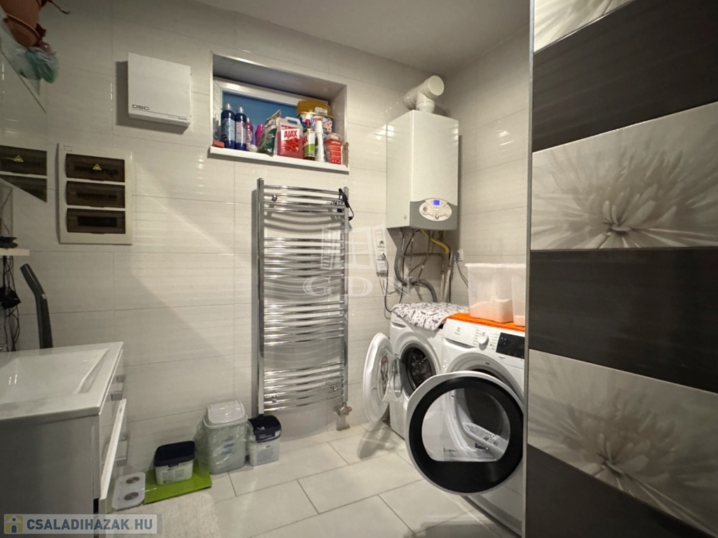 A ház fűtését Ariston kazán biztosítja radiátoros és padlófűtéses hőleadással, továbbá a kellemes komfortérzetről egy hűtő-fűtő klíma is gondoskodik. Kémény kiépítésre került, így lehetőség van kandalló, kályha telepítésre is.