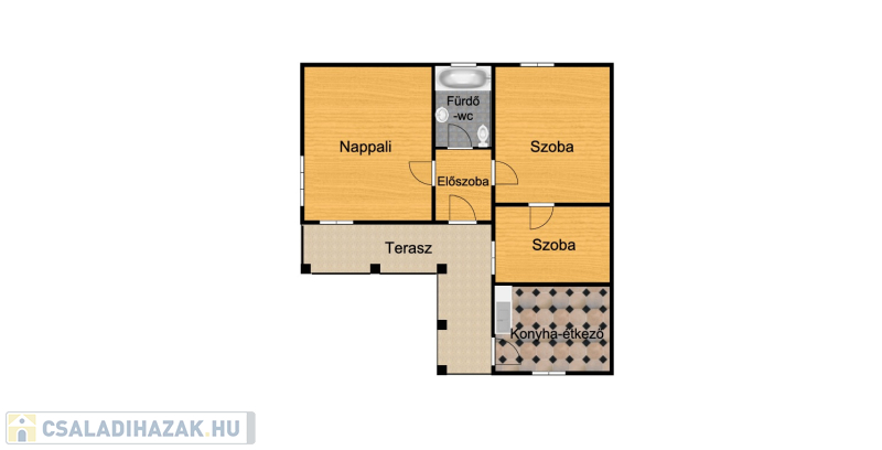 Az utcáról az udvaron át megközelíthető házba, a fedett teraszról léphetünk, az előtérbe, melyből a nappali egy szoba és a fürdőszoba érhető el. A szobába belépve pedig a harmadik szobát érjük el.