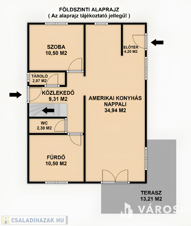 Földszint: amerikai konyhás nappali, egy hálószoba, háztartási helyiség, külön WC, fürdőszoba káddal, zuhanyzóval és szaunával, közlekedő, előtér, terasz.