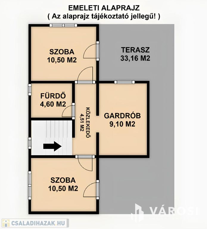 Emelet: három hálószoba, fürdőszoba zuhanyzóval és WC-vel, terasz, amely két hálószobából is megközelíthető.