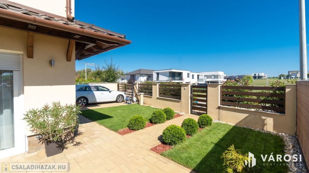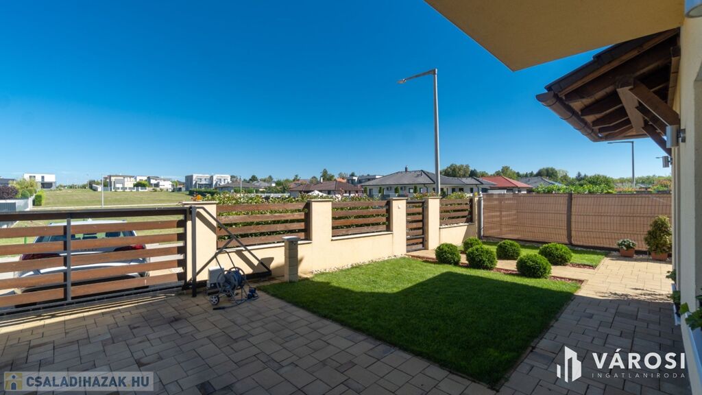 A kertkapcsolatos ingatlanhoz egy gyönyörű, ízlésesen parkosított kertrész, valamint 20 m² fedett térkövezett terasz is tartozik ahol akár grillezhet is a család és a barátok társaságában.