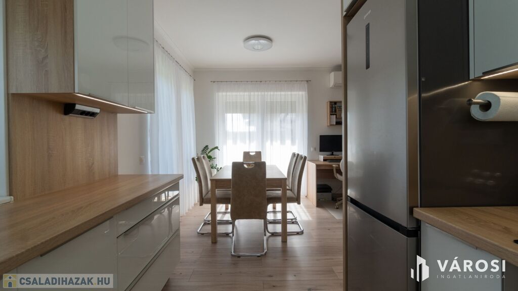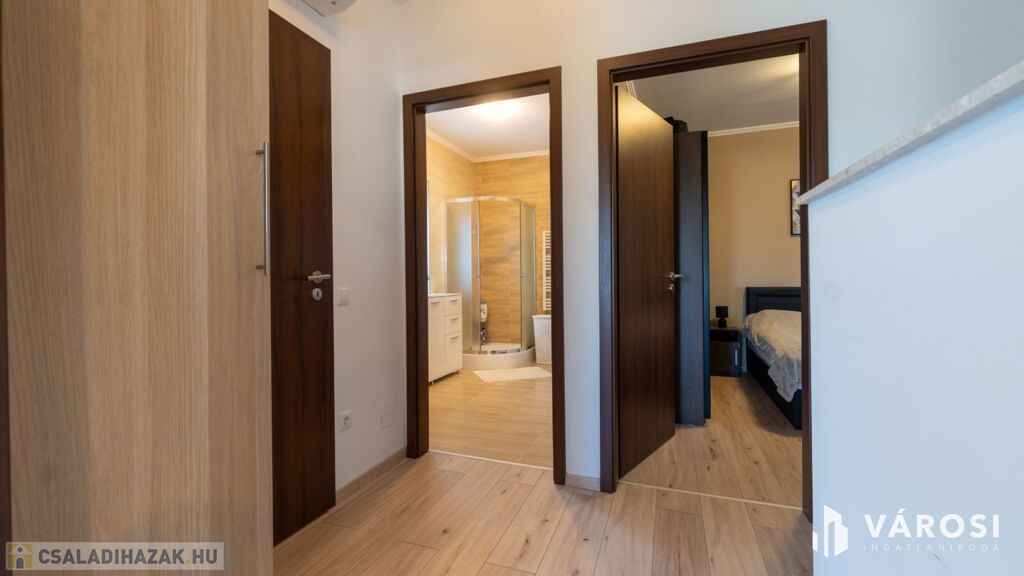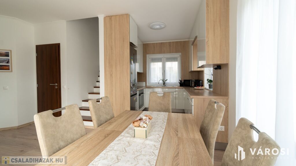 Eladó Siófok Sóstó városrészén egy 2020-ban épült ikerház utcafronti része. Az épület kiváló állapotban van. Precízen átgondolt, rendkívül praktikusan megtervezett bruttó 115 m²-es házról van szó, melyhez 30 m² térkövezett terasz (melyből 20 m² fedett), egy nagy 7m²-es erkély, valamint udvaron belüli térkövezett gépjárműbeálló tartozik. Az ingatlan külön helyrajzi számon van saját telekhányaddal, mely 174 m². Összesen 86 m² nettó lakótérről beszélhetünk. A földszinten található az amerikai konyhás nappali, egy szoba, egy fürdőszoba és egy külön WC. Az emelet 2 szobával, egy nagy fürdőszobával, gépészeti helyiséggel, közlekedővel, valamint egy tágas 7 m²-es erkéllyel rendelkezik.