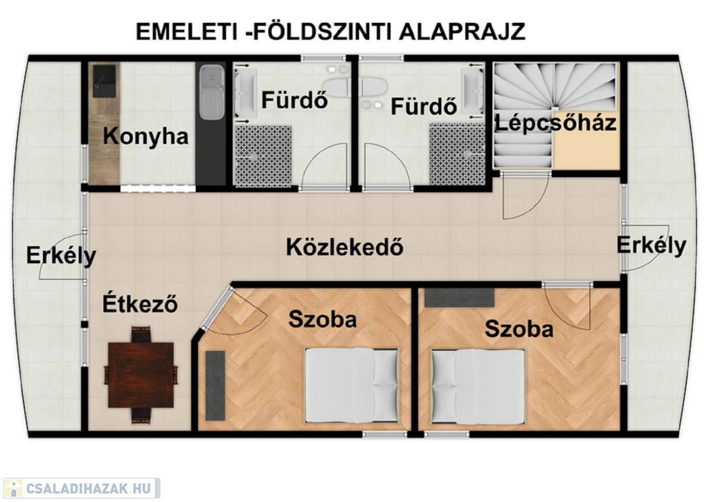 -emeleten: nappali(étkező), 2 fürdőszoba, konyha és 2 lakószoba kapott helyet