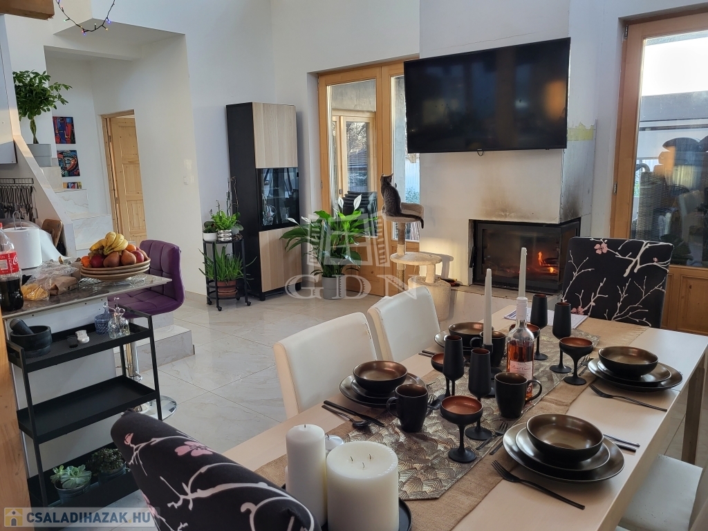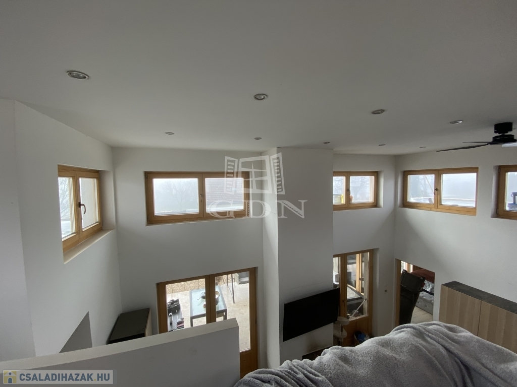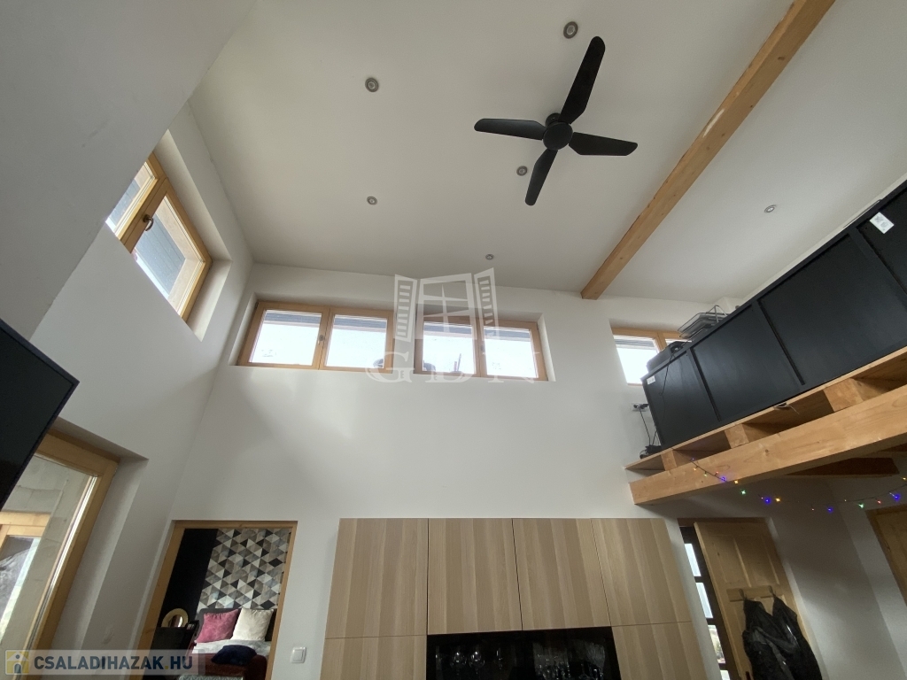 A ház központi része a tágas nappali+amerikai konyha+étkező helyiség, amely összesen 35 m2 és hozzá tartozik még egy 12 m2-es galéria. A nappaliban egy hangulatos kandalló került kialakításra, melynek hátoldalán kerti kemence is kiépíthető. A nappaliban jellemzően a világos színek dominálnak és sok ablak került kialakításra benne, így egy luxus hatású, világos helyiség amely eléri a 4,5 méteres belmagasságot is.
