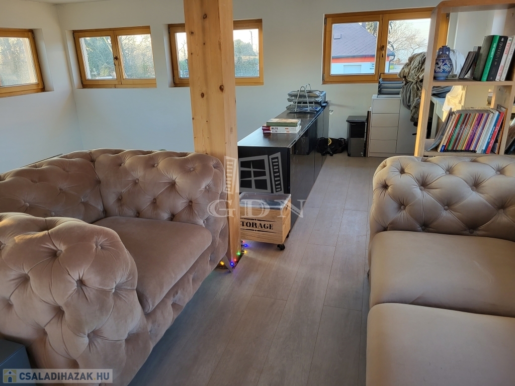Az épület 12 helyiségből áll, mely tartalmaz egy nappali+amerikai konyha+étkező helyiséget és a felette kialakított galériát, 3 db 12-13 m2-es hálószobát, 2 fürdőszobát valamint előszobát, gardróbszobát, háztartási helyiséget, toalettet és egy kamrát. A házhoz 2 terasz helyiség is tartozik melyek 8,24 m2 valamint 16,98 m2 területűek