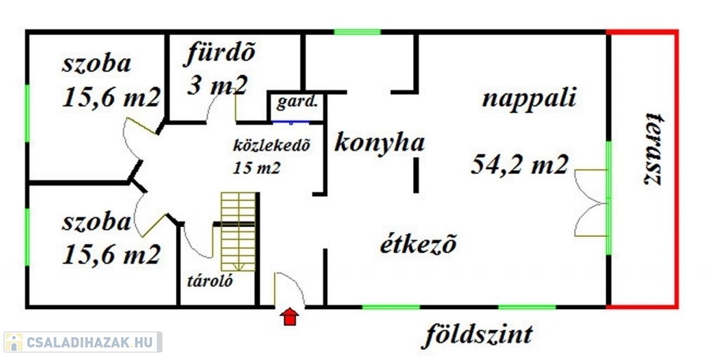 A földszinti részen tágas, terasz kapcsolatos , hatalmas ablakokkal ellátott amerikai konyhás nappali étkezővel, két kényelmes méretű hálószoba, fürdőszoba és egy nagy méretű előszoba beépített gardróbbal kapott helyet.