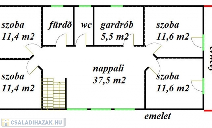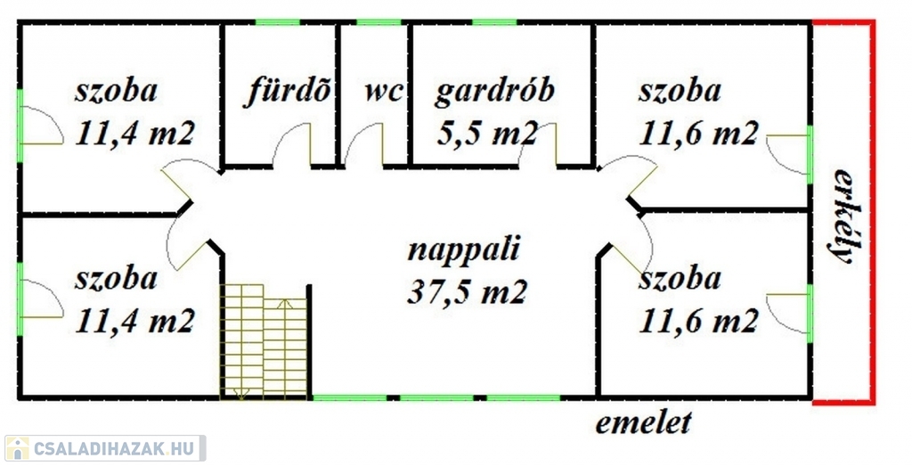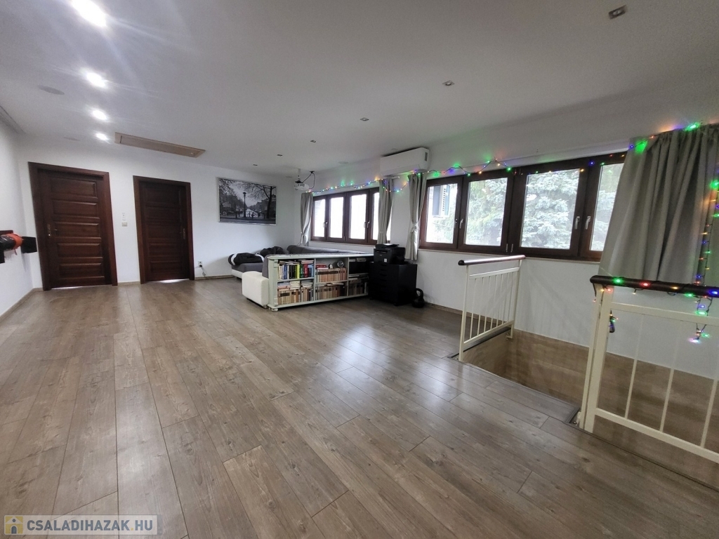 Az emeleten egy tágas, napfényes közös tér házi mozi rendszerrel, 4 erkélyes hálószoba, kényelmes mellékhelyiség, illetve fürdőszoba lett kialakítva.