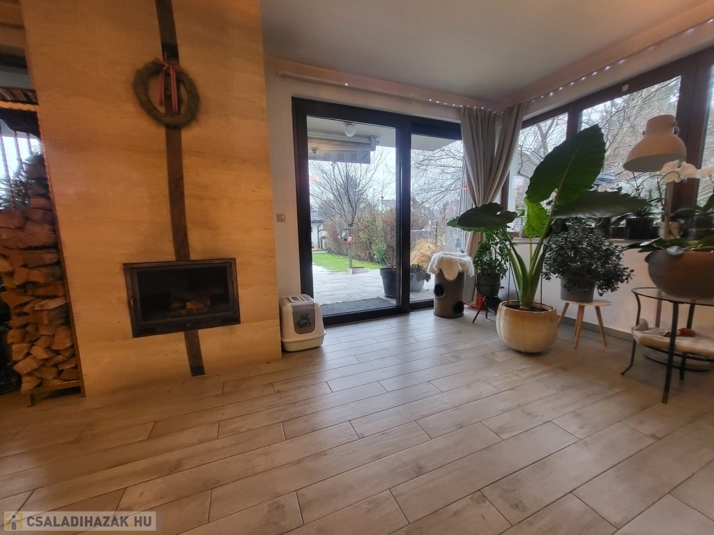 A fűtést modern kondenzációs gázkazán, padlófűtés, radiátorok, valamint a nappaliban kandalló biztosítja.