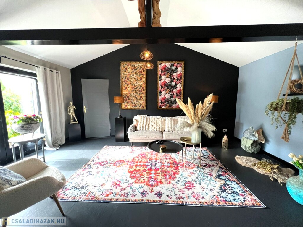 Az ingatlan jellemzői: A főbejáraton át egy világos közlekedőbe érkezünk, ahonnan minden helyiség könnyen megközelíthető. Innen jutunk el a fényes, jelenleg olvasótérként használt előszobába, amelyből nyílik a modern, gépesített konyha étkezővel, valamint az egyik barátságos hálószoba. A közlekedő másik irányába található a zuhanyzós fürdőszoba WC-vel, egy külön helyiség, amelyet most mosókonyhaként használnak, továbbá a nagy belmagasságú, rendkívül világos nappali, amely a ház központi tere. Innen közelíthető meg a másik, tágas és kényelmes hálószoba is. A fa nyílászárók tovább erősítik a ház természetes, otthonos hangulatát.