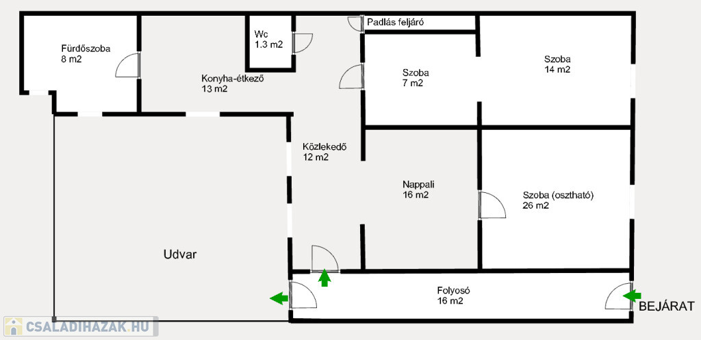 Az elrendezés megtekinthető az alaprajzon, egyszerű könnyen kivitelezhető átalakítási lehetőség adott, ha több külön nyíló szobára lenne szükség.