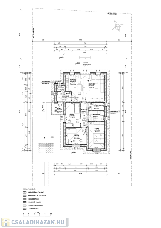 A tartószerkezeti falak Porotherm P30N+F téglából, betonkoszorúval, fa födémes tetőszerkezettel készülnek. A lábazat 10 cm polisztirol lépésálló, a homlokzatok 15cm-es EPS, a vízszintes födém 25 cm ásványgyapot szigeteléssel lesz ellátva.