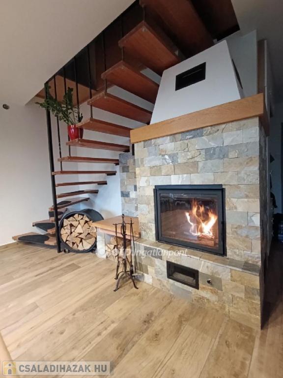 A fűtésről egy Edilkamin márkájú, nyers, görög MÁRVÁNY burkolatú, vízteres fatüzelésű kandalló gondoskodik, ami egy nagy puffertartályon keresztül minden helyiség radiátorára rákötésre került.