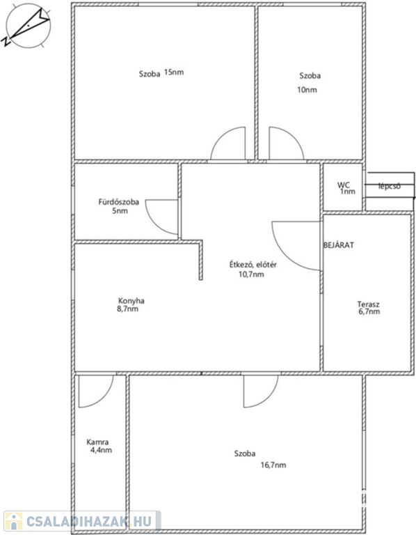 A ház tágas, jól alakítható terekkel rendelkezik: nagy terasz, világos étkező–előszoba, konyha, fürdő, nappali és két hálószoba. A tetőtér beépíthető, így az ingatlan tovább bővíthető.