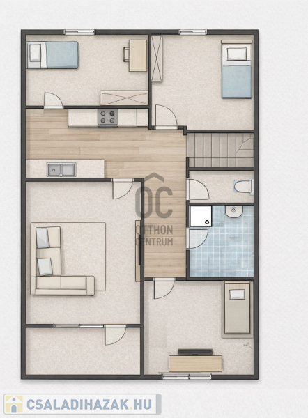 A tetőtéri szint nappali, konyha–étkező, 3 hálószoba, zuhanyzós fürdő, külön WC kiosztású.