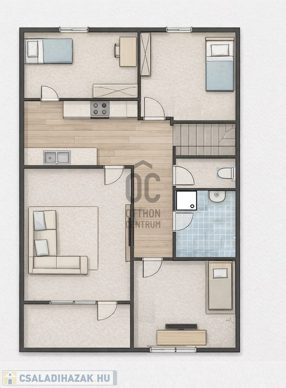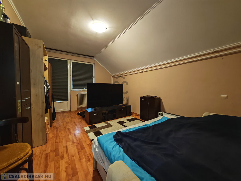 A tetőtéri szint nappali, konyha–étkező, 3 hálószoba, zuhanyzós fürdő, külön WC kiosztású.